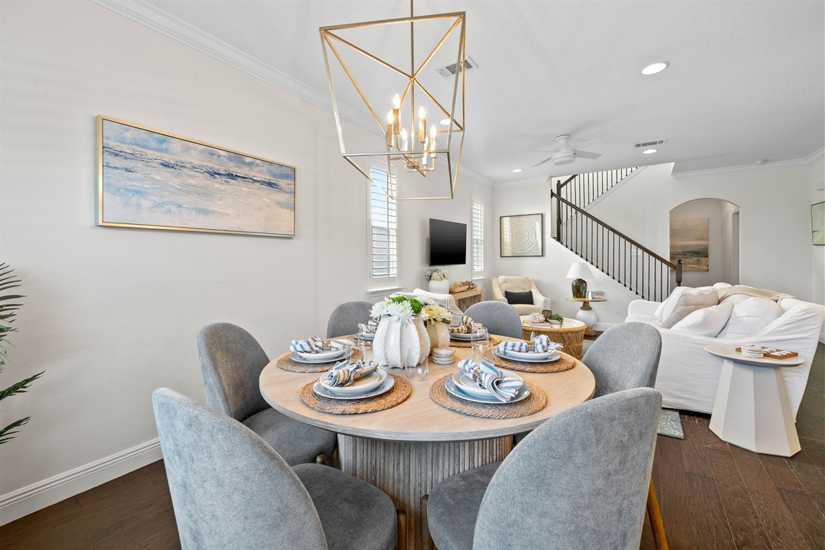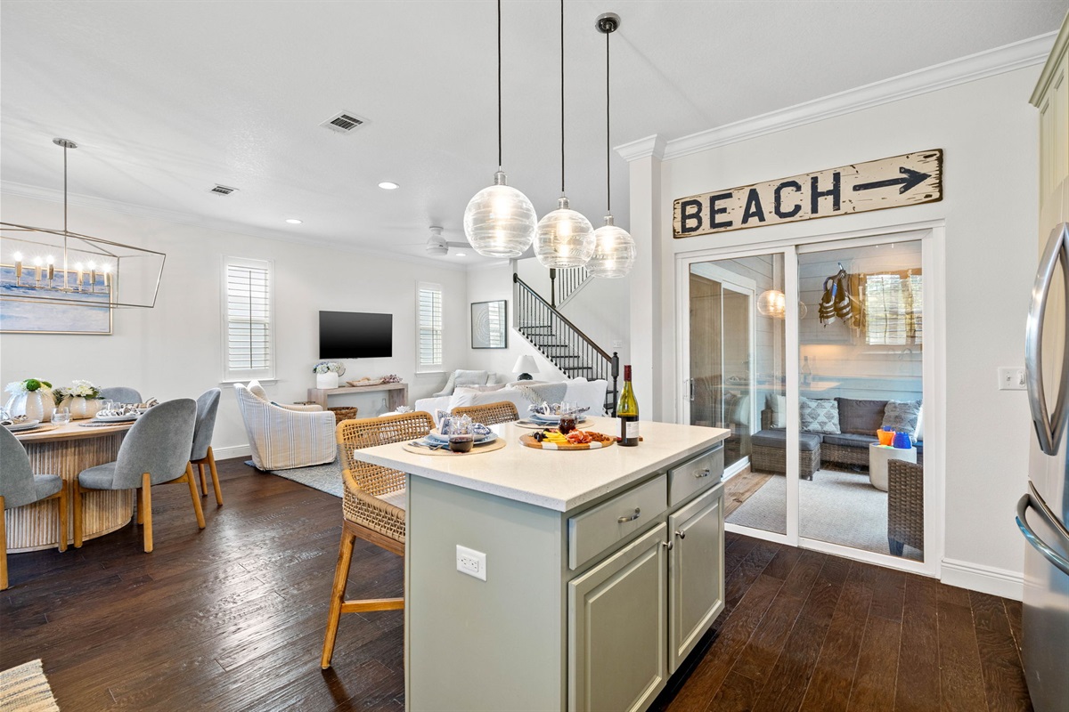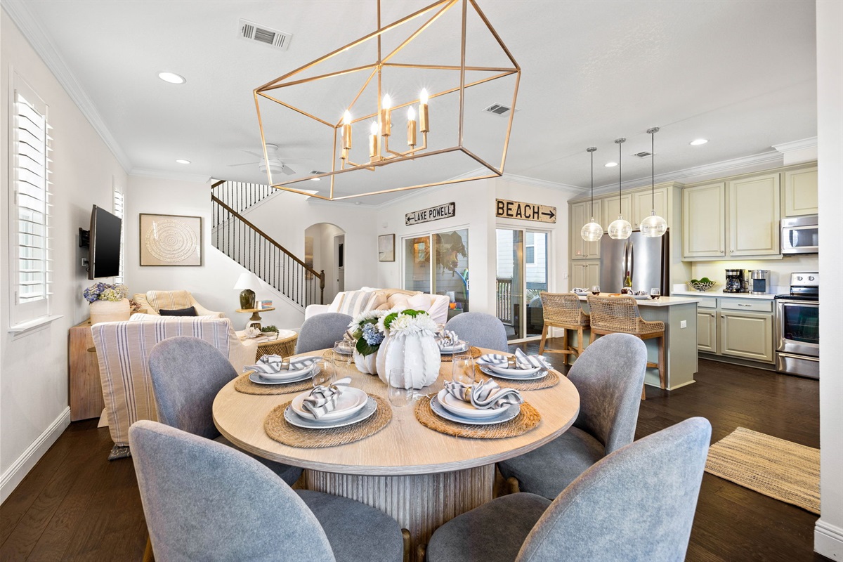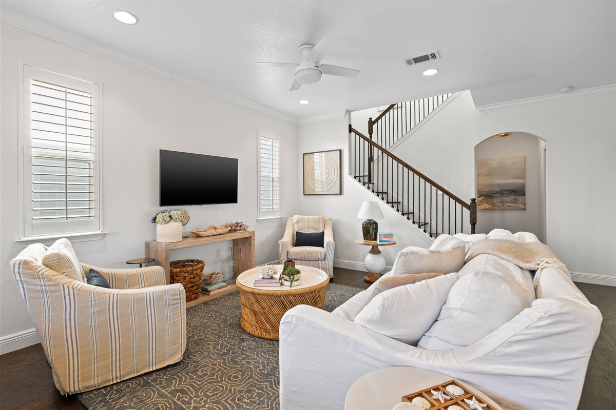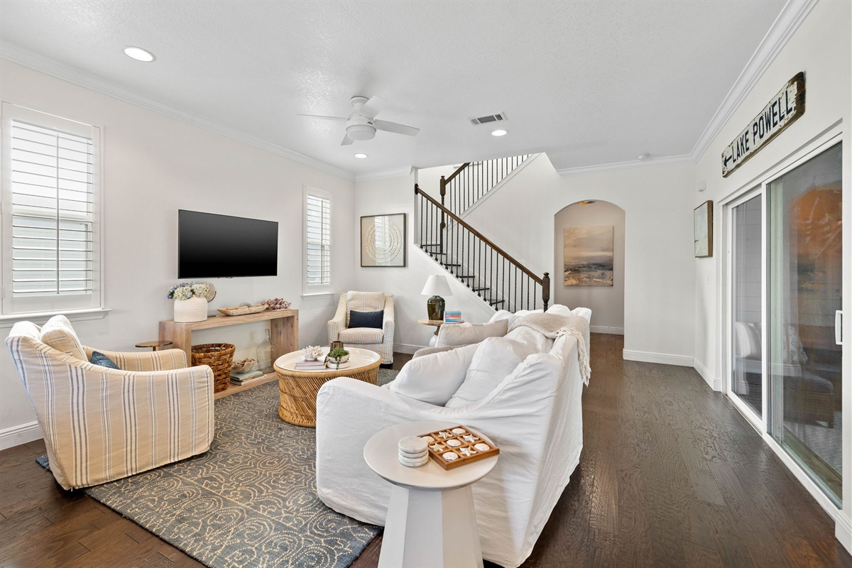 • Bright, open-concept living and dining area with plush seating and a 65” smart TV.