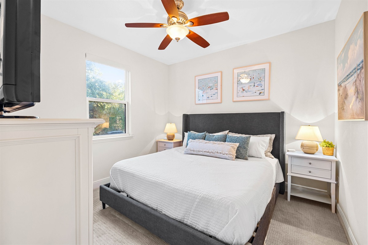 • One bedroom with a queen bed.